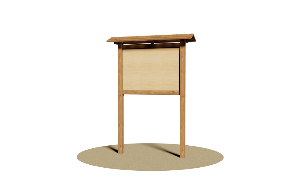 Bacheca in legno arredo parco giochi. Realizzata in legno di pino nordico impregnato in autoclave con sali atossici. Formata da due montanti di sez. cm 9 x 9 e cornice che alloggia la pannellatura centrale per affissioni in multistrato di mogano okoumè ad incollaggio fenolico trattato con vernice trasparente a base di cera dim. cm 100 x 100. Tetto a due falde in legno perlinato. Assemblaggio mediante bulloneria in acciaio zincato 8.8 e dadi autobloccanti.