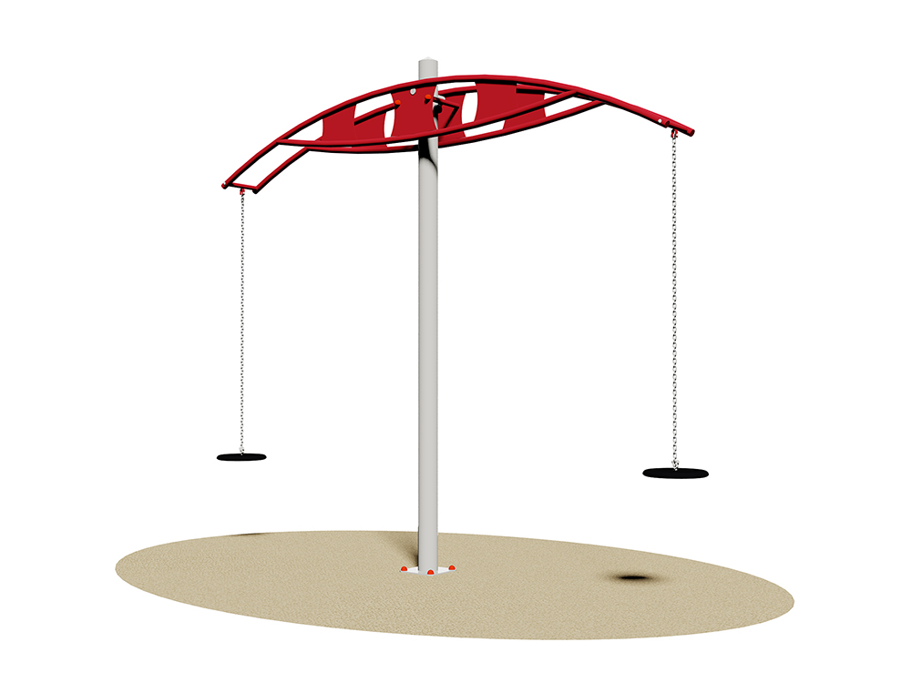 Realizzato interamente con tubi di acciaio zincato. La struttura portante è costituita da un montante centrale in acciaio zincato verniciato in forno a 180°C di diametro 12 cm e fissato al suolo tramite attacco da interrare. La struttura oscillante è costituita da tubi in acciaio zincato verniciato in forno a 180°C di diametro 3 cm; a questa sui due estremi si fissano le postazioni di gioco costituite da sedili circolari in gomma antiurto con anima interna in profilato di alluminio, appesi con catene a maglia stretta in acciaio zincato a caldo.