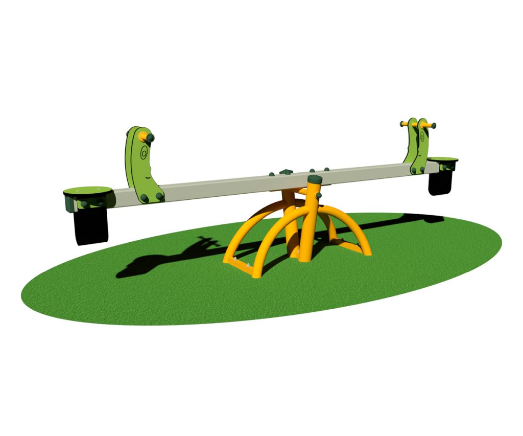 L’asse dell’altalena a bilico ha una sezione di 90×90 mm, cui sono fissate 2 sedute dotate di maniglie per garantire una presa sempre salda. L’oscillazione della giostra è stata da un meccanismo a fulcro e cuscinetti in teflon, la cui sicurezza è garantita da dispositivi ammortizzanti in gomma telata posizionati all’estremità della trave.