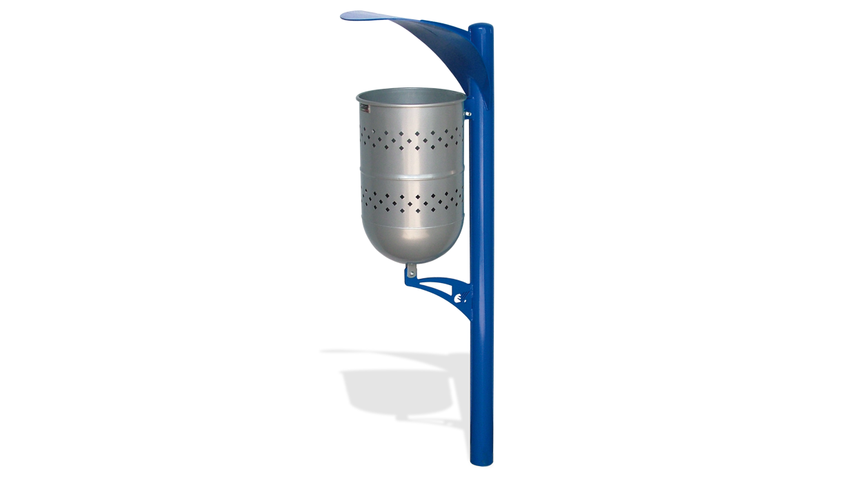 Cestino per la raccolta dei rifiuti urbani indifferenziati modello Argo. Struttura realizzata con un montante di sostegno in tubo tondo di acciaio zincato completo di tappo semi-sferico in acciaio zincato alla sommità. Coperchio a foglia con lunetta di rinforzo, ricavate da taglio a tecnologia laser, in lamiera zincata e braccetto per il sostegno del cesto ricavato da taglio a tecnologia laser con foro ed intagli decorativi sempre in lamiera di acciaio zincata. Cesto di forma cilindrica realizzato in lamiera di acciaio zincata con tre zone piene e due zone caratterizzate da fori disposti a rombi alternati. Nella parte centrale, il cesto, presenta una nervatura di irrigidimento. Parte superiore bordata anti taglio e fondo costituito da una calotta semisferica con fori per lo scarico delle acque meteoriche. Lo svuotamento del cesto avviene mediante lo sgancio della vite a brugola e ribaltamento frontale del cesto. Fissaggio al terreno mediante prolungamento del montante di sostegno nel sottosuolo. Cesto fornito in kit di assemblaggio. La finitura base per questo prodotto si compone di due colori, nello specifico, colore “blu traffico” RAL 5017 per il montante di sostegno ed il coperchio, colore “alluminio brillante” per il cesto. Il cliente può comunque richiedere una finitura differente, a scelta tra i colori RAL a disposizione sul nostro sito web. La tecnica di verniciatura adottata per la struttura in acciaio zincato è a polveri termoindurenti con cottura a forno.