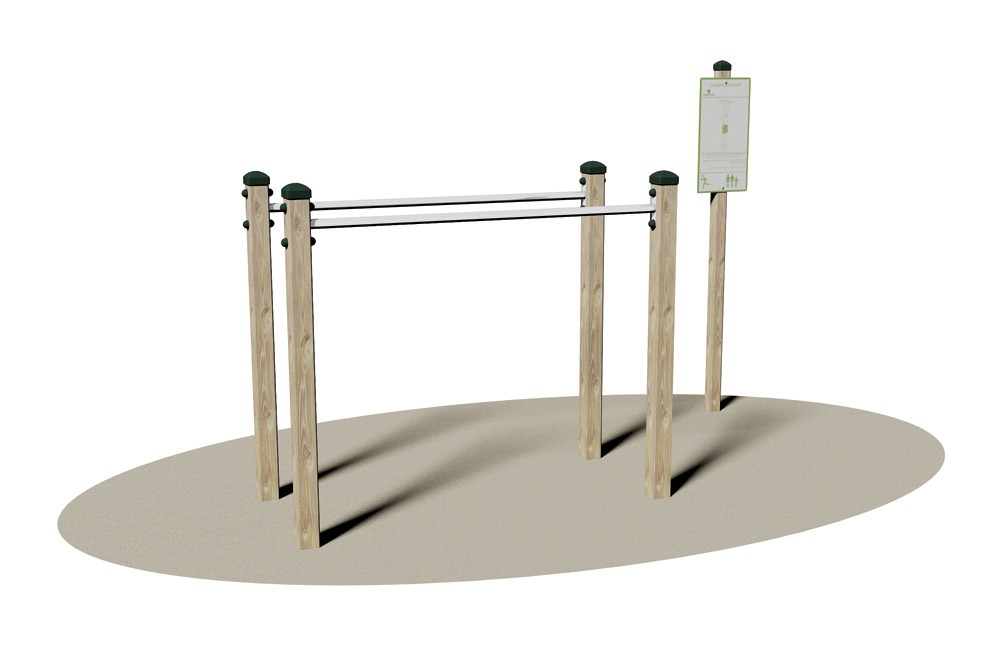 Conforme alla Norma Europea EN 1176. Parallele ginnastica all’aperto. Realizzato in legno lamellare di pino nordico impregnato in autoclave con sali atossici. Costituita da n° 4 montanti della sez. cm 9 x 9, assemblati a n° 2 barre orizzontali realizzate con tubo tondo di acciaio zincato a caldo della sez. Ø 4 cm. La stazione è munita di cartello (opzionale) art. 2139 cm 62×33 in alluminio Dibond® spess. mm 3 sul quale vi è serigrafato l’esercizio, con relativa descrizione, e il numero di ripetizioni; il cartello è sorretto da un palo in legno lamellare della sez. cm 7 x 7 ed altezza cm 250 da interrare. Assemblaggio mediante bulloneria in acciaio zincato 8.8 e dadi autobloccanti. Elementi copridado a norma in nylon colorato. Tappi copripalo in polietilene.