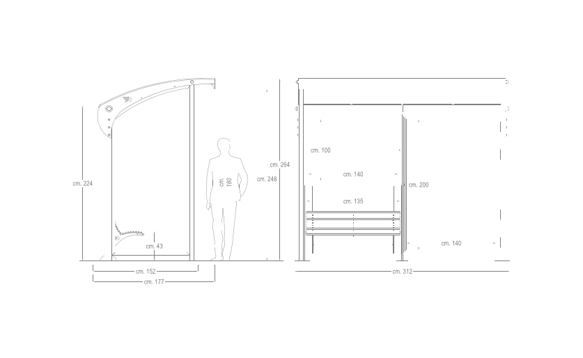 Le arcate sono collegate e rese solidali tra loro, da correnti in tubo tondo di acciaio e da intelaiatura in tubo rettangolare di acciaio zincato. Entrambi i correnti, inoltre, sono provvisti di tappi terminali in PVC a testa sferica. Modulo destro, vista fronte, costituito da parete di fondo in scatolato di acciaio zincato, inglobata tra i montanti verticali della pensilina al fine di evitare qualsiasi sporgenza esterna.