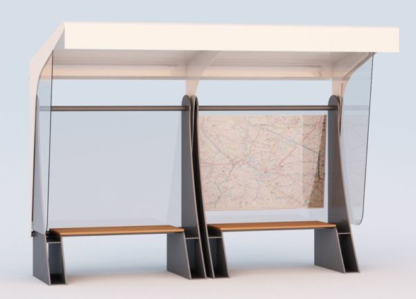 Pensilina per la fermata dell’autobus con spazio per le mappe, ideale per l’arredo urbano. Costruita nel rispetto dell’attuale normativa EN 1090-1: 2009 + A1: 2011 ad applicazione obbligatoria a partire da 1° Luglio 2014 in qualità di elemento di carpenteria metallica per uso strutturale.