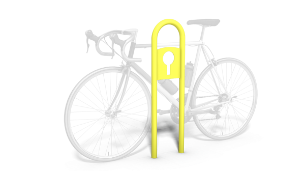 Porta bici per arredo urbano modello Lucchetto, ricavato da un robusto tubo tondo di acciaio zincato sagomato ad U con sistema di fissaggio al terreno mediante prolungamento dei montanti nel sottosuolo, piastra di aggancio per catena realizzata in lamiera di acciaio zincata e caratterizzata da uno svuotamento centrale ottenuto con taglio laser raffigurante una serratura stilizzata. La finitura base per questo prodotto è di colore “giallo zinco” RAL 1018,