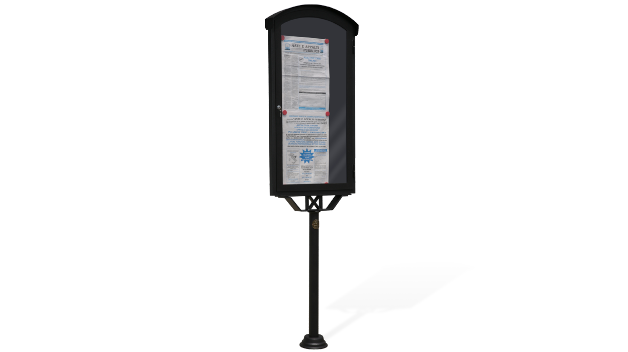 Tabella per affissioni descrittive realizzata in acciaio zincato, modello Santiago. Struttura composta da tabella in scatolato di acciaio zincato con fascia sagomata ad arco nella parte superiore, lato di lettura realizzato in policarbonato compatto trasparente, infrangibile, protetto ai raggi UV e particolarmente adatto per l’esterno. Montante di sostegno in tubo tondo di acciaio zincato, braccetto con elementi decorativi zincati per il sostegno della tabella e flangia decorativa a copertura del foro praticato per l’ancoraggio al terreno. L’ancoraggio avviene mediante il prolungamento del montante nel sottosuolo. La finitura base per le parti metalliche di questo prodotto è del colore “canna fucile” caratterizzato da una cromia grigio scuro dall’effetto metallico
