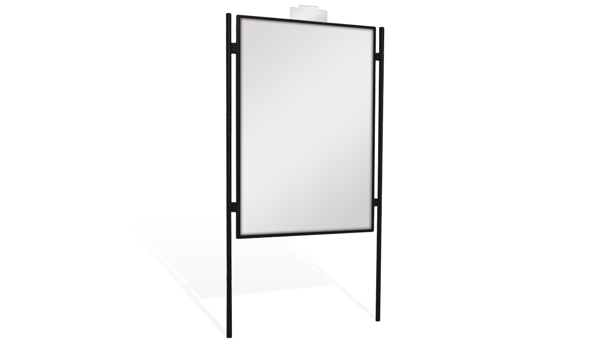 Tabellone per affissioni pubbliche di tipo bi-facciale, realizzato in metallo modello Visual. Struttura composta da cornice perimetrale realizzata in scatolato di acciaio zincato corredata, nella parte superiore, di targhetta (smontabile) per apporre l’eventuale denominazione del Comune. Pannello per affissioni, in lamiera zincata, applicato all’interno del profilo scatolato, quattro piastre di collegamento in lamiera zincata, saldate sui lati lunghi della cornice perimetrale. Montanti di sostegno in tubo tondo di acciaio zincato completi di tappi terminali in PVC, ogni singolo montante è provvisto di due piastre di collegamento. L’ancoraggio avviene mediante il prolungamento del montante nel sottosuolo. La finitura base per le parti metalliche di questo prodotto è del colore “canna fucile” caratterizzato da una cromia grigio scuro dall’effetto metallico.