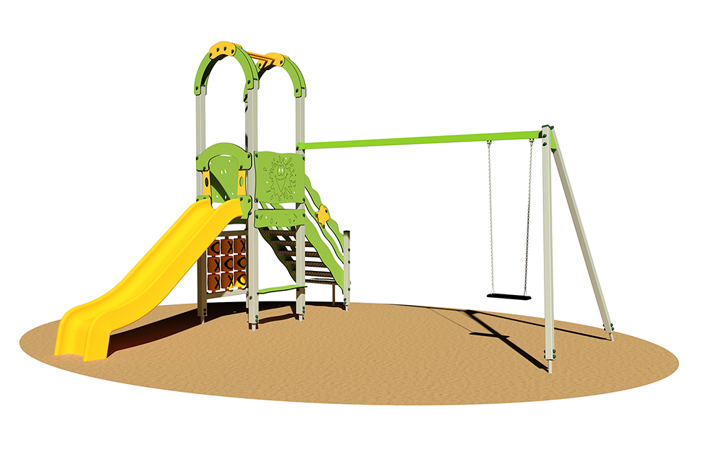 Realizzata con montanti in alluminio di lega EN AW 6060 e pannelli in bilaminato stratificato HPL pantografati e privi di spigoli. Elenco componenti: N°1 torretta con montanti in alluminio sez. cm 9×9, pedana (altezza caduta cm 150) in alluminio mandorlato, tetto decorativo realizzato con pannelli in HPL e tubolari di acciaio zincato e verniciato, pannelli protettivi in bilaminato stratificato HPL da mm 8, panchetta in bilaminato stratificato in HPL da mm 15. Dim. cm 100x100x360h; N°1 scala di risalita realizzata con supporti laterali in bilaminato stratificato HPL da mm 15 e gradini in alluminio mandorlato. Lateralmente, è munita di protezioni in bilaminato stratificato HPL da mm 15, aventi la funzione di passamano. N°1 scivolo H cm 150 in polietilene rotazionale colorato in massa ad alta densità, collegato alla struttura con pannelli in bilaminato stratificato HPL da mm 15; N°1 altalena con montanti in alluminio sez. cm 7×7 e trave in tubolare di acciaio zincato e verniciato, sez. cm 8×4. Il sedile è in gomma antiurto con anima interna in profilato di alluminio e catene a maglia stretta saldate e zincate a fuoco. N°1 pannello manipolativo gioco tris. Assemblaggio mediante bulloneria in acciaio zincato 8.8 e dadi autobloccanti. Elementi copridado a norma in nylon colorato. Verniciatura a forno 180°C. Tappi copripalo in polietilene. Attacchi in metallo zincato a caldo, per l’ancoraggio al suolo.