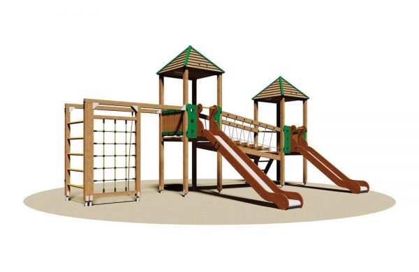 Villaggio giochi per parchi Santiago. Certificato in conformità delle Norme Europee EN 1176 dall’Istituto Tedesco TÜV – SÜD. Realizzato in legno lamellare di pino nordico impregnato in autoclave con sali atossici. Elenco componenti : N° 1 torretta con montanti in legno sez. cm 9 x 9 munita di tetto a quattro falde in legno perlinato collegate da n. 4 profili colorati. Pannelli protettivi in multistrato di mogano okoumé ad incollaggio fenolico pantografato e privo di spigoli assemblati con profili colorati. Dim cm 120 x 120 x 395 h. N°1 torretta come precedente. Dim. cm 120 x 120 x 335 h. N° 1 ponte oscillante con travetti collegati ai passamano in legno mediante catene a maglia stretta saldate e zincate a fuoco e sottostante pedana di sicurezza in legno. N° 1 scaletta di risalita con pioli, di accesso alla torretta. N° 1 scivolo h. cm 150 con pista in acciaio inox pressopiegato, sponde in multistrato di mogano okoumé ad incollaggio fenolico pantografato con spigoli arrotondati. Trattamento con impregnazione colorata e finitura con vernici atossiche a base di cera diluibili ad acqua. N° 1 scivolo h. cm 90 come precedente. In alternativa allo scivolo in con pista in acciaio e sponde in legno può essere montato uno scivolo aperto in polietilene, o uno scivolo in vetroresina. N° 1 spalliera svedese composta da pioli in iroko Ø 45 mm. N° 1 sartia in corda di nylon con anima interna in cavo di acciaio rivestito e bloccacorda in nylon colorato. N° 1 fune per arrampicata, in corda di nylon colorato con anima interna in cavo di acciaio rivestito. Assemblaggio mediante bulloneria in acciaio zincato 8.8 e dadi autobloccanti. Elementi copridado a norma in nylon colorato. Attacchi in metallo zincato a caldo per l’ancoraggio al suolo.